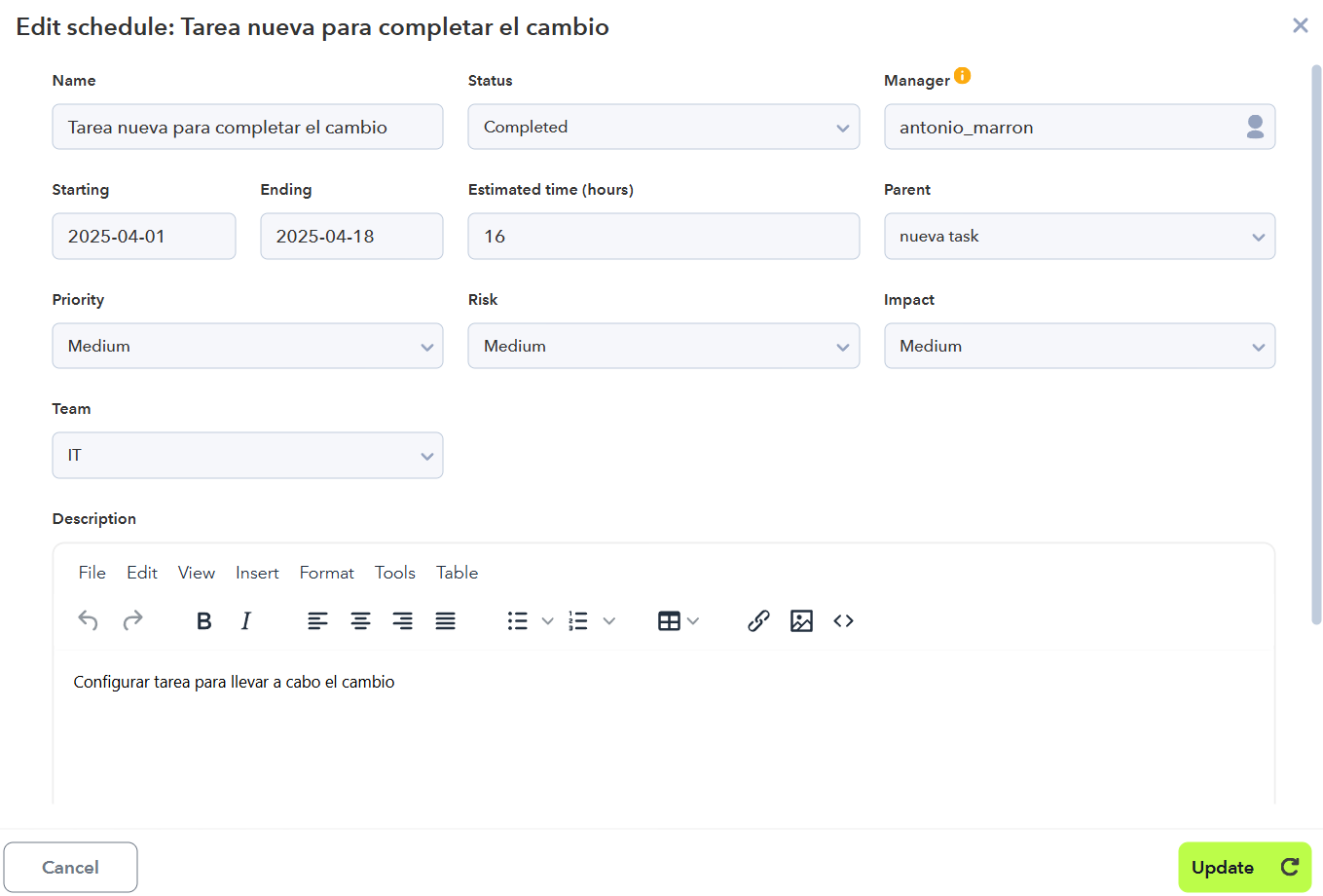 Controlling changes in IT is no longer optional. It’s a requirement for minimizing operational risks, avoiding human errors, and complying with standards such as ISO 27001, ENS, or SOC2. Many serious incidents originate from poorly managed changes: urgent interventions without documentation, informal approvals, or tasks that fall outside the scope of operational oversight.