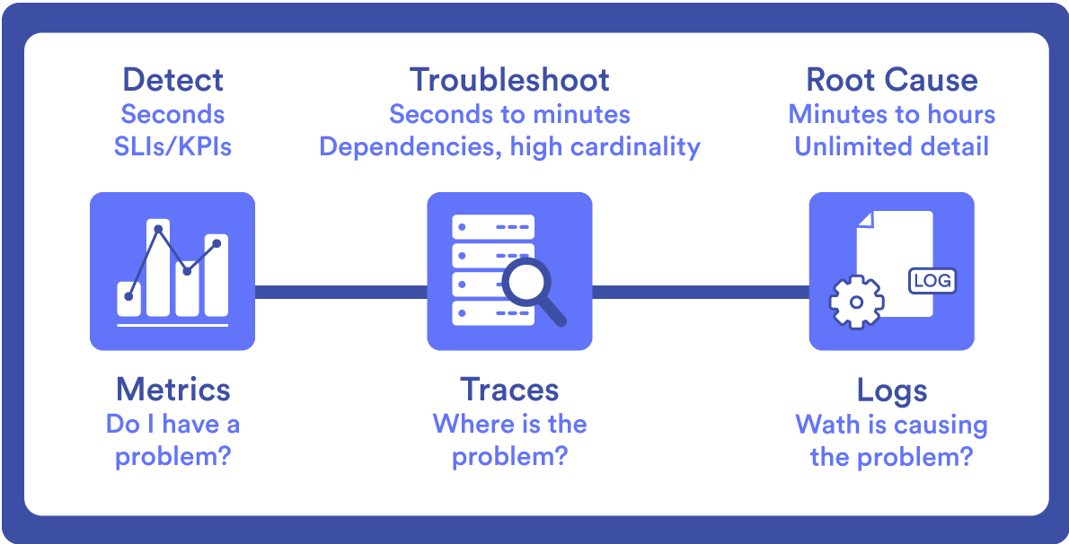 L’infrastructure doit être « invisible » pour l’utilisateur, mais visible pour les stratèges informatiques afin d’assurer la performance et les niveaux de service requis par l’entreprise, où l’observabilité (dans le cadre de SRE ou de l’ingénierie de fiabilité du site) est essentielle pour comprendre l’état interne d’un système en fonction de ses résultats externes. Pour obtenir une observabilité efficace, il existe quatre piliers clés : les métriques, les événements, les journaux et les traces (de suivi), qui sont résumés dans l’acronyme MELT