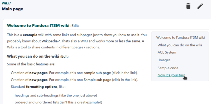 Para poder visualizar el nuevo submenú de la Wiki PITSM, luego de haber guardado pulsando el botón Save changes, se debe pulsar Wiki → Admin pages. Al volver a abrir el submenú, si se es usuario administrador de la Wiki aparecerá un botón de borrado con el icono