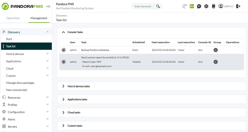 La herramienta Discovery Pandora FMS permite ver un listado de todas las tareas programadas en el entorno tanto a nivel de Consola web como a nivel de servidor. Estas tareas se distribuyen en bloques, según el tipo de tarea configurada.