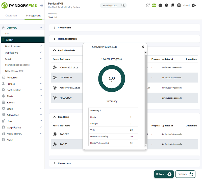 - Task list: La herramienta Discovery de Pandora FMS permite ver un listado de todas las tareas programadas en nuestro entorno tanto a nivel de consola como a nivel de servidor.