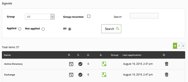 Список агентов имеет фильтр по группе, подстроке или статусу выполнения.