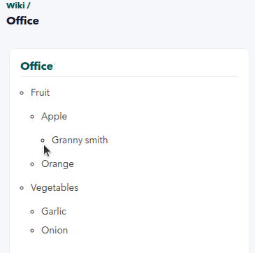 * Fruit ** Apple *** Granny smith ** Orange * Vegetables ** Garlic ** Onion
