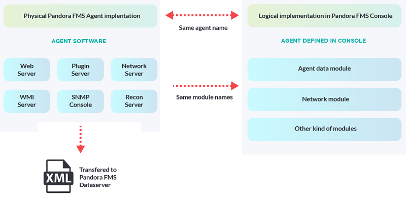 El Agente de Pandora FMS es un elemento organizativo creado en la Consola web de Pandora FMS, asociado a un grupo de Módulos (o elementos individuales de monitorización). Este agente puede tener (opcionalmente) asociadas una o más direcciones IP.