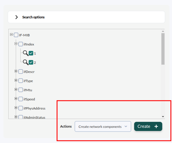 Il est possible de sélectionner plusieurs OID et de les ajouter à un ou plusieurs agents en sélectionnant Create agent modules dans la liste Actions et en appuyant ensuite sur le bouton Create :